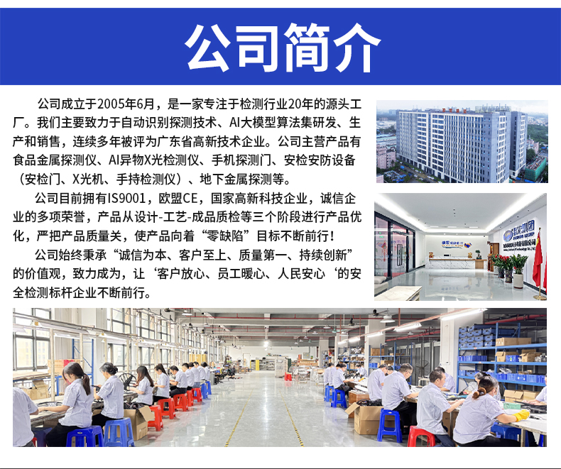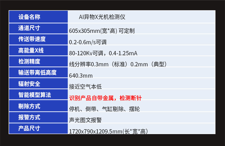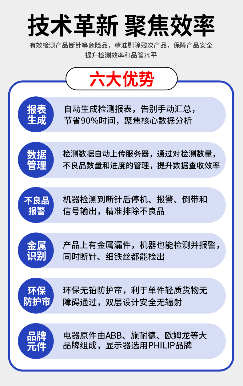采用先進的AI智能算法頻技術(shù),精準檢測斷針等金屬異物,靈敏度可達Fe 0.2mm,雙屏黑白高清成像,支持數(shù)據(jù)自動上傳服務(wù)器,檢測報表自動生成