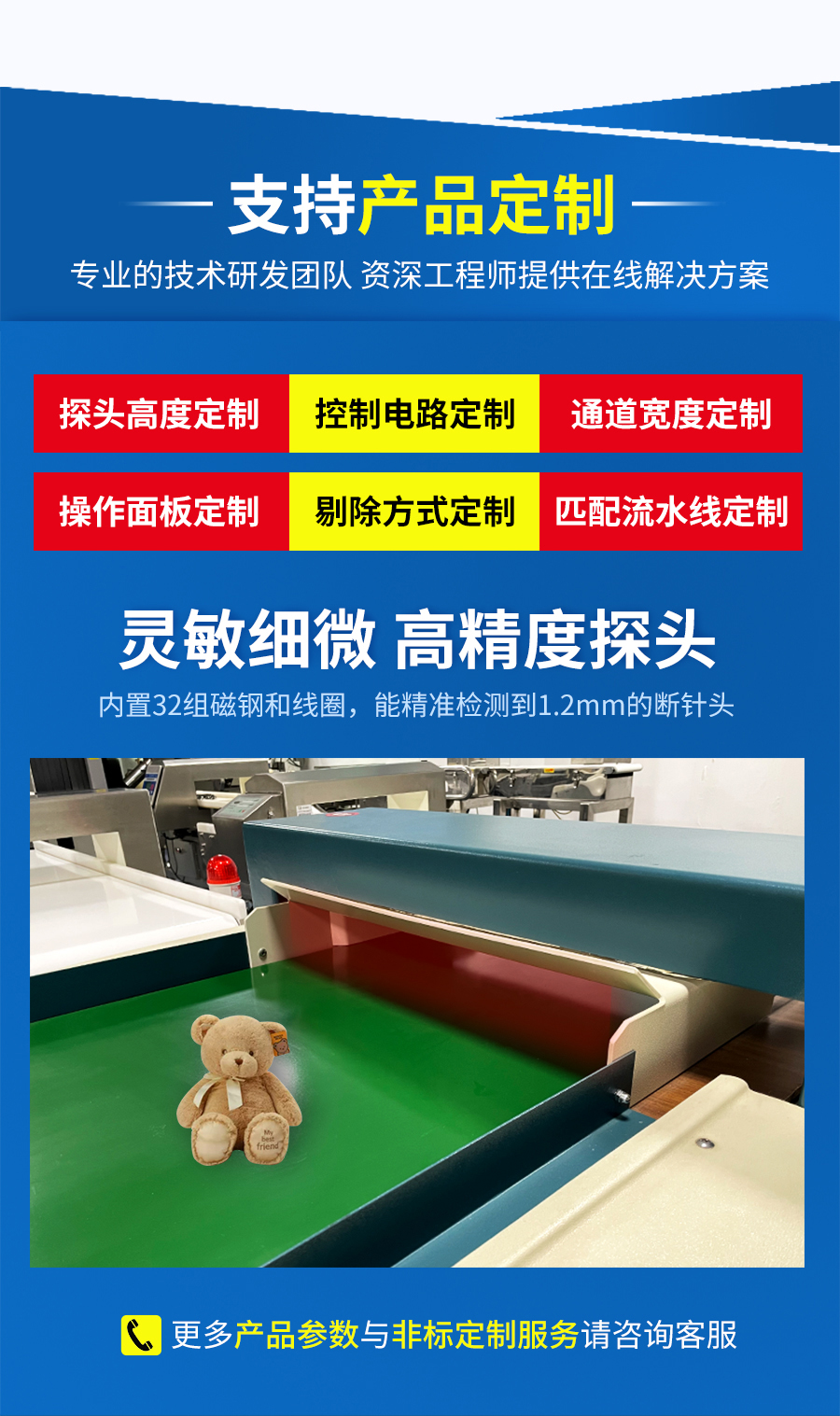 EJH-2高靈敏度抗干擾檢針機(jī)技術(shù)采用強(qiáng)抗干擾次世代數(shù)字電路,數(shù)字形態(tài)分析被檢測物體,對比傳統(tǒng)檢針機(jī)的性能,EJH-2檢針機(jī)性能具有較強(qiáng)抗干擾性和超高靈敏度。用于檢測夾雜、失落于紡織制品中的斷針(折斷的縫紉機(jī)針)、鐵絲等鐵磁性金屬(即所謂過檢針),避免給消費(fèi)者和企業(yè)帶來直接或間接的損失,該產(chǎn)品也是出口產(chǎn)品制造商和原料供應(yīng)商所必須具有的檢測設(shè)備,是企業(yè)質(zhì)量標(biāo)準(zhǔn)的象征,可以更好的為企業(yè)接納更多的外貿(mào)訂單。 適用范圍 服裝、玩具、工藝品、地毯或無紡布巾等需要檢測鐵磁性金屬雜質(zhì)檢出的行業(yè)